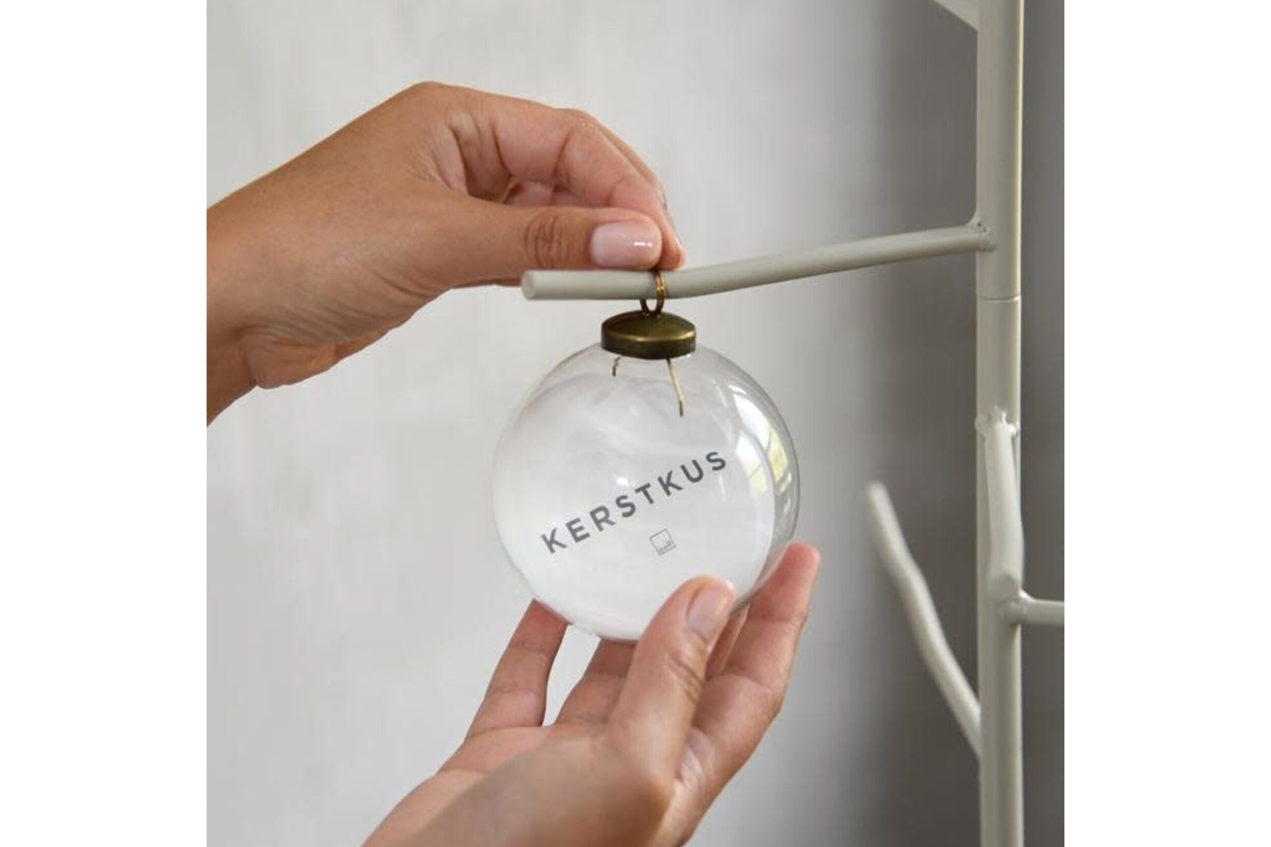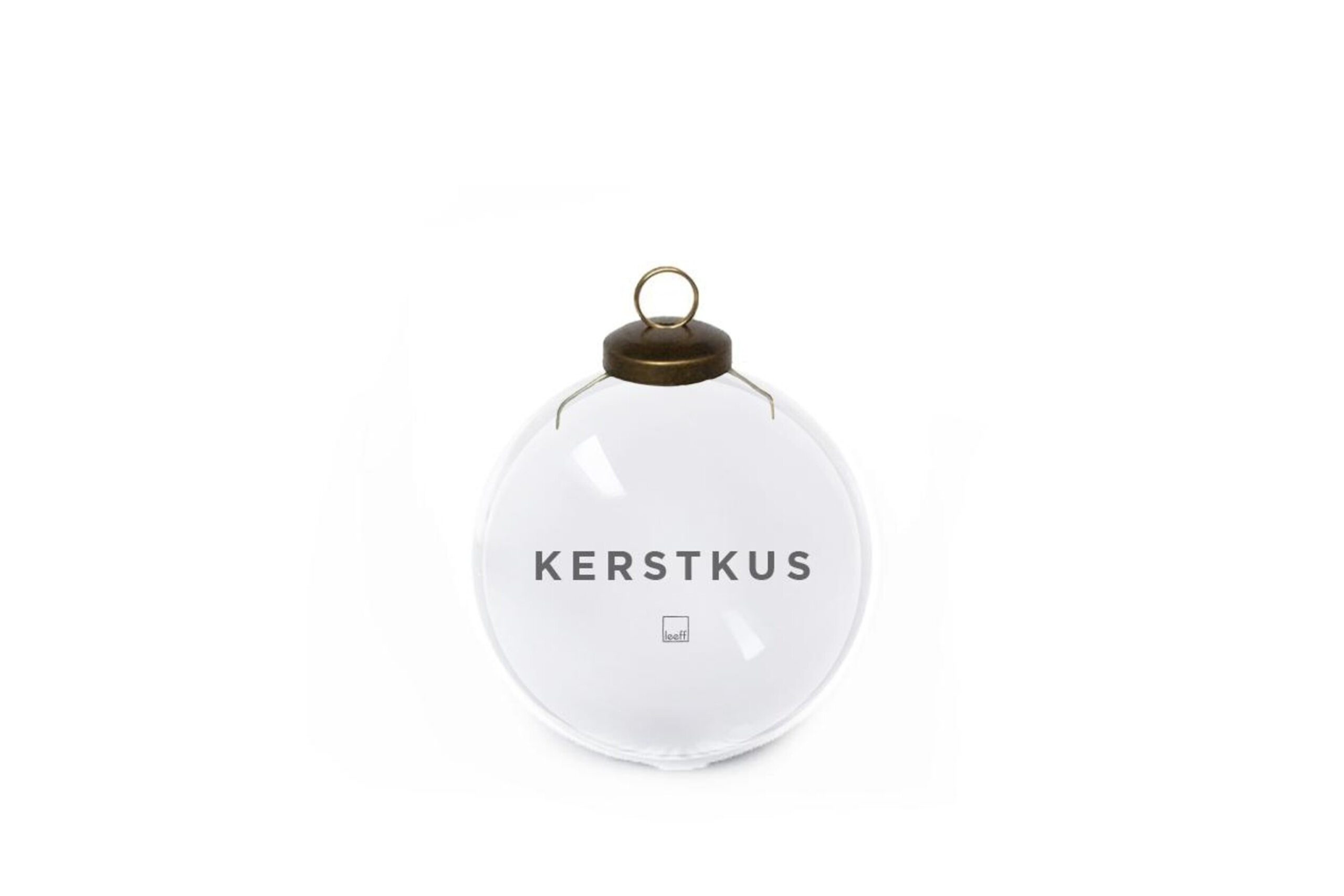 In de doorzichtige kerstbal zit een kaartje de tekst ‘Kerstkus.